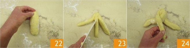 Alternativ zu den Kugeln können Sie auch kleine Zöpfe herstellen. In diesem Fall benötigen Sie eine größere Menge Teig. Für jeden kleinen Zopf werden etwa 90-100 g benötigt. Formen Sie den Teig zu einem Baguette 22, schneiden Sie das Baguette mit einem Messer oder einem Teigschaber so ein, dass Sie 3 Streifen erhalten, die an der Basis verbunden sind, also schneiden Sie sie nicht bis zum Ende ein 23. Beginnen Sie, die Enden zu flechten 24