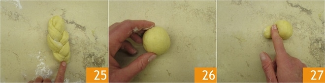 um Ihre kleinen Zöpfe zu erhalten 25. Neben den kleinen Zöpfen können Sie auch kleine Brioche mit Kuppel herstellen. Nehmen Sie etwa 40-50 g Teig und formen Sie eine Kugel 26. Dann formen Sie mit dem Finger die Kugel so, dass Sie zwei erhalten, von denen eine kleiner ist 27.