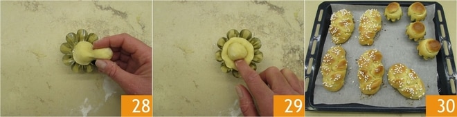 Legen Sie sie in eine geriffelte Form 28 und drücken Sie den unteren Teil leicht an 29. Lassen Sie sowohl die kleinen Zöpfe als auch die Brioche mit Kuppel eine Stunde gehen, bestreichen Sie die Oberfläche mit Eigelb und Sahne und dekorieren Sie die kleinen Zöpfe mit Zuckerstreuseln. Die kleinen Zöpfe haben eine längere Backzeit (etwa 25-30 Minuten), während für die Brioche mit Kuppel 20 Minuten ausreichen. Nehmen Sie sie aus dem Ofen 30, lassen Sie sie abkühlen und servieren Sie sie!