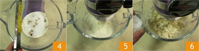 und die abgeriebene Schale einer Zitrone 4. Schalten Sie die Küchenmaschine auf mittlere Geschwindigkeit ein und gießen Sie das Wasser nach und nach hinzu 5. Sobald es gut aufgenommen wurde, fügen Sie das Salz hinzu 6