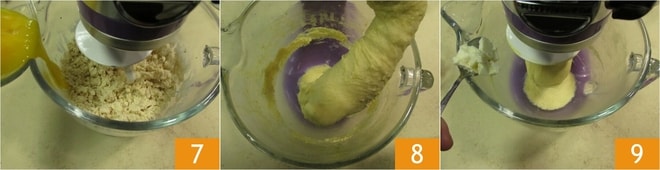 und die Eigelbe, nach und nach, und warten Sie, bis sie aufgenommen sind, bevor Sie mit den restlichen fortfahren 7. Arbeiten Sie weiter, bis der Teig gut am Knethaken haftet 8. Erst dann können Sie die weiche, aber noch plastische Butter hinzufügen, auch nach und nach 9. Warten Sie, bis ein Stück gut aufgenommen wurde, bevor Sie ein weiteres hinzufügen. Haben Sie keine Eile, sonst wird es schwierig, den Teig erneut zu binden. In dieser Phase können Sie die Maschine mehrmals anhalten und sich mit einem Teigschaber helfen, um den Teig von der Schüssel der Maschine zu lösen.