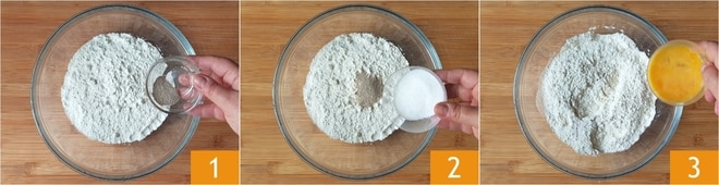 Um das Briochebrot mit Nutella zuzubereiten, beginnen Sie damit, das Mehl, die Hefe 1 und den Zucker 2 in eine Schüssel zu geben. Mit einer Gabel vermengen, dann das leicht geschlagene Ei 3 hinzufügen und nochmals vermengen.