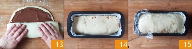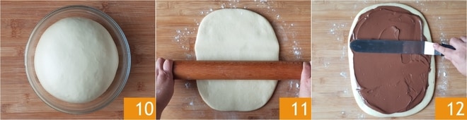 Wenn der Teig sein Volumen verdoppelt hat 10, rollen Sie ihn auf der leicht bemehlten Arbeitsfläche aus, bis er ein Rechteck von 24x40 cm bildet 11. Verteilen Sie Nutella mit einem Spatel auf der gesamten Oberfläche, wobei Sie darauf achten, etwa 1 cm vom Rand frei zu lassen 12.