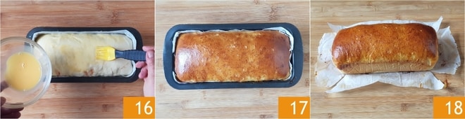 Nach dieser Zeit bestreichen Sie die Oberfläche mit dem Eigelb-Milch-Gemisch 16, dann backen Sie im vorgeheizten statischen Ofen bei 180° für etwa 20-25 Minuten und stellen Sie die Form auf die mittlere Schiene. Sobald es gebacken ist, nehmen Sie es aus dem Ofen und lassen Sie Ihr Briochebrot mit Nutella vollständig in der Form abkühlen 17, bevor Sie es 18 herausnehmen und in Scheiben schneiden!