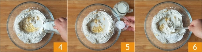 Fügen Sie die Hälfte der Milch 4 und das Salz 5 hinzu und vermischen Sie es nochmals mit der Gabel 6.