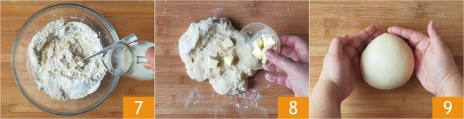 Integrieren Sie schließlich die restliche Milch 7 und kneten Sie den Teig auf der Arbeitsfläche. Fügen Sie nach und nach ein Stückchen Butter hinzu 8, wobei Sie darauf achten, das nächste erst hinzuzufügen, wenn das vorherige vollständig absorbiert ist. Kneten Sie, bis Sie einen glatten und festen Teig erhalten. Formen Sie eine Kugel 9 und legen Sie sie zurück in die Schüssel, decken Sie sie mit Frischhaltefolie ab und lassen Sie sie im ausgeschalteten Ofen mit eingeschaltetem Licht mindestens eine Stunde gehen, oder bis sich das Volumen verdoppelt hat.