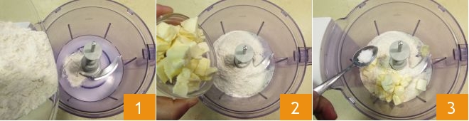 Um den Mürbeteig zuzubereiten, geben Sie das Mehl 1, die kalte Butter in Stücken aus dem Kühlschrank 2, eine Prise Salz 3 in den Mixer mit Klingen und mixen Sie alles für ein paar Sekunden.
