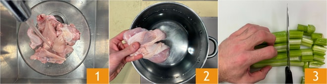 Um die Kapaunbrühe zuzubereiten, spülen Sie zuerst das Fleisch unter kaltem, fließendem Wasser ab 1, um eventuelle Verunreinigungen zu entfernen. Dann geben Sie es in einen großen Topf, zusammen mit dem Wasser 2 und bringen es bei hoher Flamme zum Kochen. Währenddessen kümmern Sie sich um das Gemüse. Schneiden Sie den Sellerie in Stücke 3.