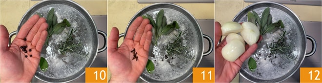 Fügen Sie auch die Wacholderbeeren 10, die Nelken 11 und die Zwiebeln 12 hinzu.