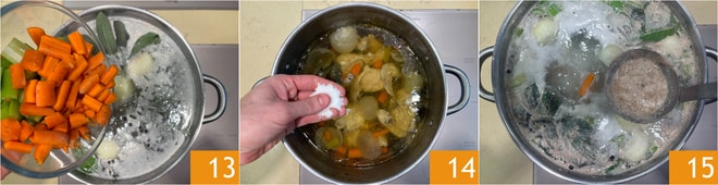 Machen Sie mit Sellerie und Karotten weiter 13. Fügen Sie eine Prise grobes Salz hinzu 14 und bringen Sie es erneut zum Kochen. Sobald es kocht, reduzieren Sie die Hitze auf ein Minimum. In den ersten 20-30 Minuten des Kochens bildet sich erneut Schaum auf der Oberfläche, den Sie mit der Kelle entfernen 15. Decken Sie den Topf teilweise mit einem Deckel ab und lassen Sie mindestens 4 Stunden kochen. Je länger es kocht, desto schmackhafter wird die Brühe. Entfernen Sie nach und nach den sich bildenden Schaum und reinigen Sie den Rand des Topfes mit einem Pinsel. Sollte es zu sehr reduziert werden, können Sie mehr Wasser hinzufügen.