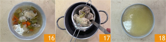 Einmal gekocht, können Sie den Kapaun zusammen mit der Brühe sofort servieren 16; alternativ können Sie die Brühe durch ein Sieb 17 oder ein Tuch filtern und nur die Brühe für Ihre Zubereitungen verwenden 18 und den gekochten Kapaun als Hauptgericht genießen.