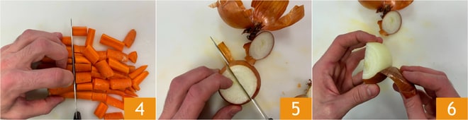 Machen Sie dasselbe mit den Karotten 4. Schneiden Sie die Zwiebeln in Hälften 5 und entfernen Sie die Schale 6.