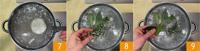 Wenn der Kapaun kocht, bildet sich Schaum, den Sie vorsichtig mit einer Kelle entfernen 7. Fügen Sie den Salbei, den Rosmarin 8 und das Lorbeerblatt 9 hinzu.