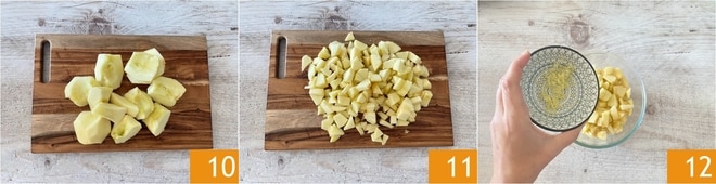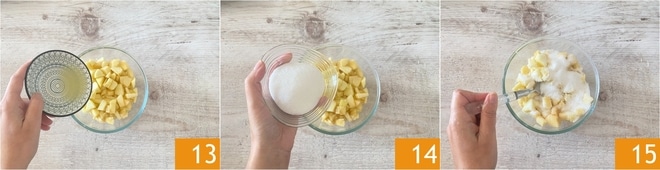 Bereiten Sie die Apfel- und Amaretti-Füllung vor. Entfernen Sie die Schale von den Äpfeln, halbieren Sie sie, entfernen Sie das Kerngehäuse und schneiden Sie sie dann in 4 Stücke 10. Schneiden Sie diese in 1 cm große Würfel 11. Geben Sie die Apfelwürfel in eine Schüssel und fügen Sie die Zitronenschale hinzu 12.