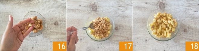 Zerbröseln Sie die Amaretti grob mit den Händen 16 und fügen Sie sie zu den Äpfeln hinzu 17. Mischen Sie gut 18.
