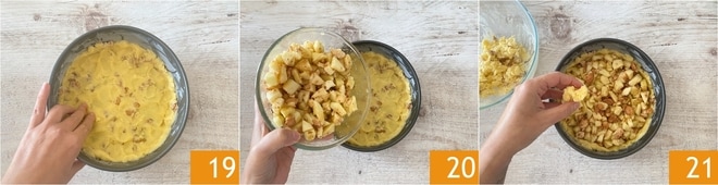 Butter und mehlen Sie eine Springform mit 20 cm Durchmesser. Verteilen Sie ¾ des Teiges auf dem Boden der Form, drücken Sie ihn mit den Händen fest, um den gesamten Boden zu bedecken und die Ränder anzuheben, um die Füllung zu halten 19. Geben Sie die Äpfel mit den Amaretti hinein 20, glätten Sie sie und bedecken Sie sie mit dem restlichen Streuselteig 21.