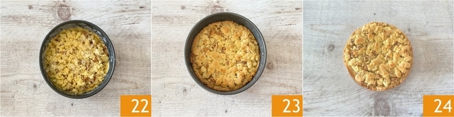 Versuchen Sie, die Äpfel vollständig zu bedecken, ohne diesmal zu drücken 22. Backen Sie den Apfelstreuselkuchen in einem vorgeheizten statischen Ofen bei 180° für etwa 35 Minuten. Nehmen Sie ihn aus dem Ofen 23 und lassen Sie ihn vollständig abkühlen, bevor Sie ihn aus der Form nehmen 24 und servieren.