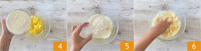 Integrieren Sie das vorher gesiebte Weizenmehl Typ 00 4 und das ebenfalls gesiebte Backpulver 5. Kneten Sie mit den Fingerspitzen 6, bis Sie eine krümelige Masse erhalten.