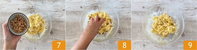 Fügen Sie nun auch die Walnüsse hinzu 7 und kneten Sie kurz weiter 8, bis die Zutaten vermischt sind 9. Stellen Sie die Mischung bis zur Verwendung in den Kühlschrank.