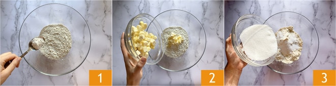 Um den Streuselkuchen mit Sahne zuzubereiten, arbeiten Sie in einer Schüssel Mehl, Backpulver 1, kalte Butter in Stücken 2, die Samen einer Vanilleschote und Salz zusammen. Vermischen Sie dann alles, bis Sie eine sandige Konsistenz erreichen. Fügen Sie dann den Zucker hinzu 3,
