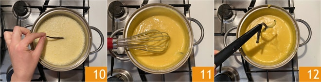 Fügen Sie die restliche Vanilleschote vom Teig hinzu 10 und kochen Sie die Creme bei niedriger Hitze, unter Rühren mit einem Schneebesen, für 6-7 Minuten 11. Wenn die Creme eingedickt ist, nehmen Sie sie vom Herd und entfernen Sie die Vanilleschote 12. Lassen Sie die Creme abkühlen.