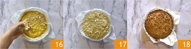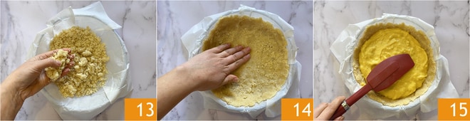 Legen Sie eine 24 cm große Form mit Backpapier aus. Gießen Sie etwas mehr als die Hälfte des krümeligen Teigs ein 13. Verteilen Sie ihn auf dem Boden und am Rand. Drücken Sie den Teig mit den Händen fest 14. Gießen Sie die vorbereitete Creme darauf und glätten Sie sie mit einem Spatel, ohne über die Ränder des Teigs hinauszugehen 15.