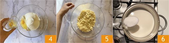 die Eier 4, integrieren Sie sie und krümeln Sie den Teig erneut mit den Fingern. Decken Sie die Schüssel mit Frischhaltefolie ab 5 und lassen Sie sie 1 Stunde im Kühlschrank ruhen. In der Zwischenzeit bereiten Sie die Vanillecreme vor: Gießen Sie die Milch in einen Topf, fügen Sie den Zucker hinzu 6,