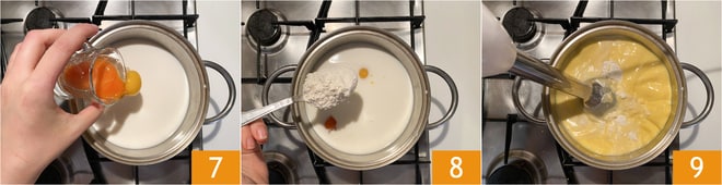 die Eigelbe 7 und das Mehl 8. Mixen Sie die Zutaten mit einem Stabmixer, um sie zu vermischen 9.