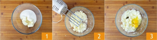 Um den Streuselkuchen mit Ricotta und Marmelade zuzubereiten, lassen Sie zuerst den Ricotta 30 Minuten lang in einem feinmaschigen Sieb abtropfen. In der Zwischenzeit kümmern Sie sich um die Zubereitung des Bodens. Geben Sie in eine Schüssel den Zucker, fügen Sie die Butter hinzu 1 und arbeiten Sie einige Minuten mit einem Handmixer, bis Sie eine krümelige Mischung erhalten 2. Fügen Sie dann die Eier und das Vanilleextrakt hinzu 3.