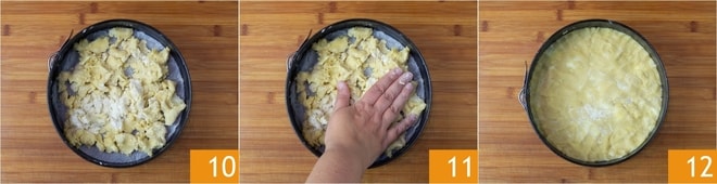 Legen Sie eine 22 cm Springform mit Backpapier aus, verteilen Sie die Hälfte der Mischung darin 10 und drücken Sie sie mit den Händen fest 11, bis Sie den Boden der Form vollständig bedecken 12.