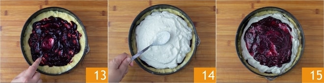 Bedecken Sie den Boden mit der Hälfte der Konfitüre und lassen Sie einen Rand von etwa 1 cm frei 13, gießen Sie dann auch die Ricotta-Creme 14. Zum Schluss geben Sie vorsichtig den Rest der Konfitüre auf die Creme 15.
