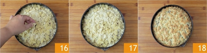 Bedecken Sie alles mit der restlichen Mischung 16 und gehen Sie bis zum äußeren Rand 17. Backen Sie im statischen Ofen bei 180° für 45 Minuten, bis der Streuselkuchen gut goldbraun ist 18. Lassen Sie ihn vollständig abkühlen und nehmen Sie ihn aus der Form. Der Streuselkuchen mit Ricotta und Marmelade ist bereit, genossen zu werden!
