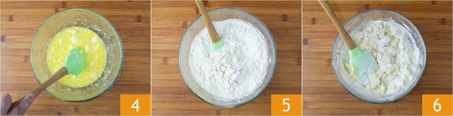 Arbeiten Sie die Mischung mit dem Spatel 4, fügen Sie dann das gesiebte Mehl Typ 00 und das Backpulver hinzu 5. Mischen Sie zunächst mit einem Spatel 6.