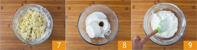 Machen Sie dann mit den Händen weiter, bis Sie große Krümel erhalten und beiseite stellen 7. Gehen Sie zur Füllung über: Geben Sie in eine Schüssel den Zucker, den Ricotta und das Vanilleextrakt 8, dann arbeiten Sie mit dem Spatel, das Ergebnis muss eine homogene Creme sein 9.