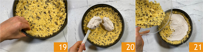 Machen Sie dasselbe, um die Ränder zu formen 19. In die Mitte die Ricottacreme geben 20 und glatt streichen, dann den restlichen Teil der Mürbeteigkrümel hinzufügen 21.