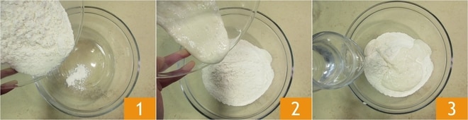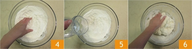 Beginnen Sie, den Teig mit den Händen zu kneten 4, fügen Sie dann das restliche Wasser hinzu 5 und kneten Sie erneut mit den Händen 6.