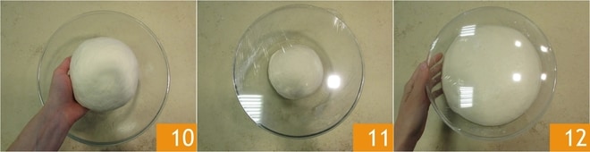 Legen Sie den Teig in eine Schüssel, die Sie vorher mit Öl bepinselt haben 10, decken Sie ihn mit Frischhaltefolie ab 11 und lassen Sie ihn mindestens 12 Stunden bei einer Temperatur von 21-23° ruhen 12.