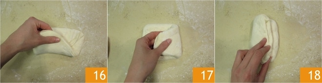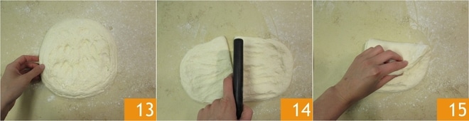 Nachdem die Zeit vergangen ist, übertragen Sie den Teig auf die leicht bemehlte Arbeitsfläche, dehnen Sie ihn leicht aus 13 und teilen Sie ihn in zwei Teile 14. Nehmen Sie das erste Stück und bringen Sie die obere Kante zur Mitte 15.