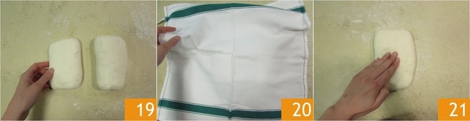 Wiederholen Sie dasselbe mit dem zweiten Teigstück 19, decken Sie es mit einem Tuch ab 20 und lassen Sie es 30 Minuten ruhen. Geben Sie jedem Teigstück vier Falten und lassen Sie es mit einem Tuch bedeckt etwa 30 Minuten ruhen. Nach der erforderlichen Zeit nehmen Sie eines der Teigstücke und drücken es leicht mit den Händen flach 21.