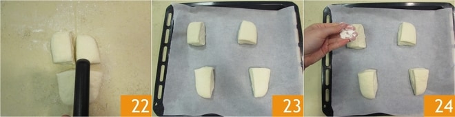 Schneiden Sie es in vier gleiche Teile und legen Sie die Brötchen auf ein mit Backpapier ausgelegtes Blech, lassen Sie ausreichend Abstand. Lassen Sie sie eine Stunde gehen 23, dann nehmen Sie etwas Mehl und bestäuben die Brötchen damit 23.