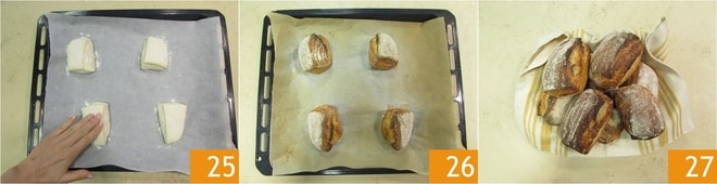 Entfernen Sie dann vorsichtig das überschüssige Mehl, indem Sie sie mit der Hand sanft abstreichen 24. Backen Sie die Brötchen mit Sauerteig im vorgeheizten statischen Ofen bei 240° und stellen Sie eine kleine Schale mit Wasser auf den Boden des Ofens. Backen Sie sie etwa 40 Minuten, dann nehmen Sie sie heraus 26 und lassen sie abkühlen, bevor Sie sie servieren 27.