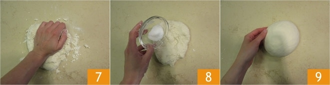 Wenn das Wasser aufgenommen wurde, übertragen Sie den Teig auf die Arbeitsfläche und kneten Sie weiter 7, bis ein homogener und elastischer Teig entsteht. Fügen Sie nun das Salz hinzu 8 und kneten Sie kräftig mindestens 10 Minuten weiter, bis der Teig glatt ist 9.