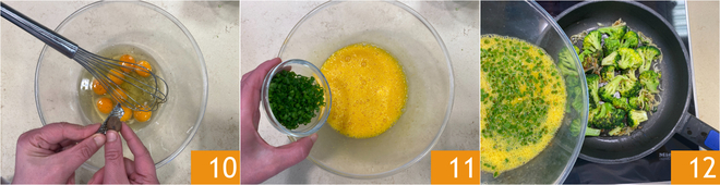 Fügen Sie auch eine Prise Muskatnuss 10 und fein gehackten Schnittlauch hinzu 11. Schlagen Sie die Mischung gut und gießen Sie sie über die Brokkoli, nachdem Sie den Knoblauch entfernt haben 12.