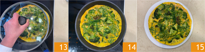 Bedecken Sie die Pfanne mit einem Deckel und kochen Sie das Omelett bei schwacher Hitze etwa 15 Minuten lang 13; auf diese Weise müssen Sie das Omelett nicht wenden 14. Sobald es goldbraun ist, servieren Sie Ihr Brokkoli-Omelett sofort 15!