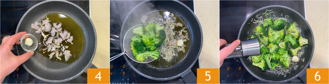 Geben Sie das Öl, die Schalotte und den Knoblauch in eine Pfanne 4. Dünsten Sie alles etwa 5 Minuten bei schwacher Hitze, dann schöpfen Sie die Brokkoli-Röschen direkt in die Pfanne 5. Fügen Sie auch ein wenig Kochwasser und Pfeffer hinzu 6.