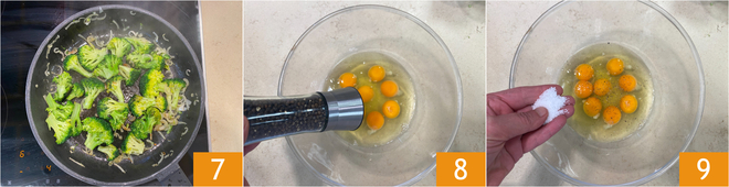 Kochen Sie bei mittlerer bis hoher Hitze etwa 8 Minuten 7. In der Zwischenzeit brechen Sie die Eier in eine Schüssel und würzen Sie sie mit Pfeffer 8 und Salz 9.