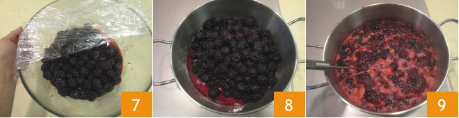 Nach der Mazerationszeit haben die Brombeeren ihren Saft freigesetzt 7, dann alles in einen Topf geben 8 und bei mittlerer bis kleiner Hitze kochen, bis die Mischung eine Temperatur von 108° erreicht, was mit einem Küchenthermometer gemessen wird 9.