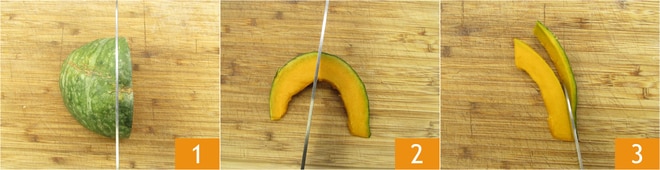 Um den Crostone mit gegrilltem Kürbis und Robiola zuzubereiten, beginnen Sie mit dem Kürbis: Schneiden Sie ihn in Scheiben von etwa 0,5 cm 1, entfernen Sie die Samen, halbieren Sie sie 2 und schälen Sie sie 3.