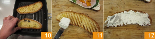 Rösten Sie auch das Brot auf dem Grill, bis es goldbraun ist 10. Beginnen Sie mit der Zusammensetzung des Crostone: Verteilen Sie eine Schicht von etwa 45 g Robiola 11 auf jede Scheibe 12.