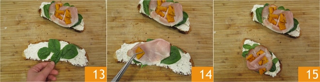 Belegen Sie dann mit jungen Spinatblättern 13, Prager Schinken und gegrilltem Kürbis 14. Der Crostone mit gegrilltem Kürbis und Robiola ist bereit, genossen zu werden 15.